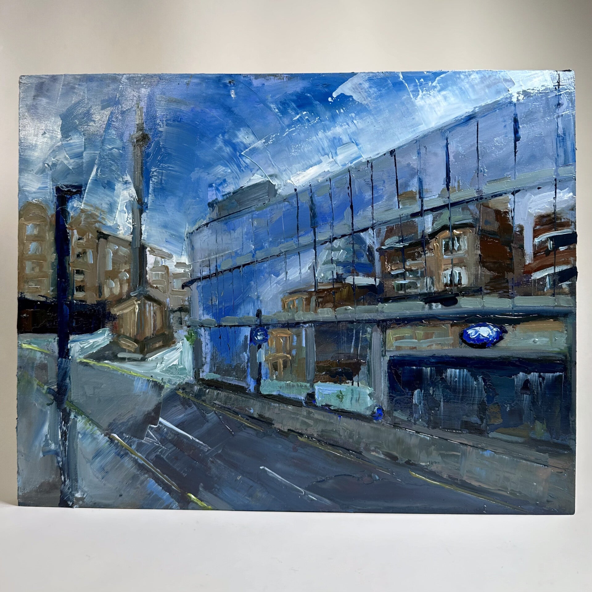 Jade is a fourth year Newcastle University Fine Art graduate. Her work Blackett Street captures a quick glance at the morning reflections upon the empty streets of Newcastle city centre. Working on a smooth panel surface allowing her paint brush & palette knife to glide across the composition